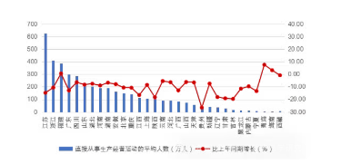 圖 4 2025 年上半年各地區(qū)直接從事生產(chǎn)經(jīng)營活動(dòng)的平均人數(shù)及其增長情況